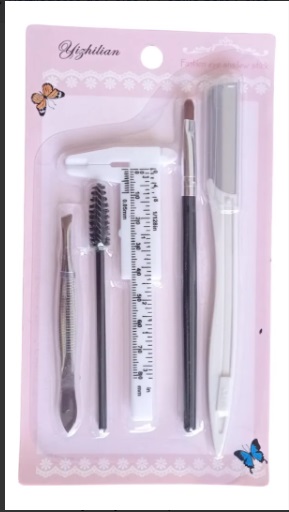 El kit incluye: pinza de cejas, calibre de 8 cm, brush, pincel, perfilador.